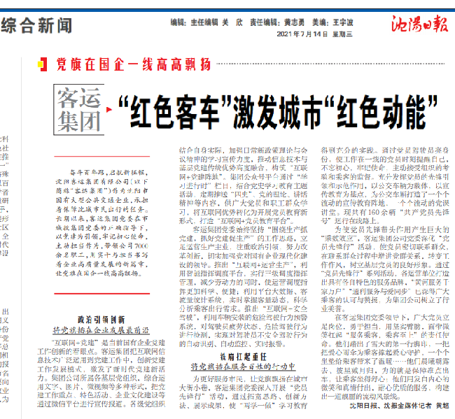 7月14日,沈陽日報以《 “紅色客車”激發(fā)城市“紅色動能”》為題報道了沈陽客運集團以黨建為引領(lǐng),助推企業(yè)高質(zhì)量發(fā)展之新變化。