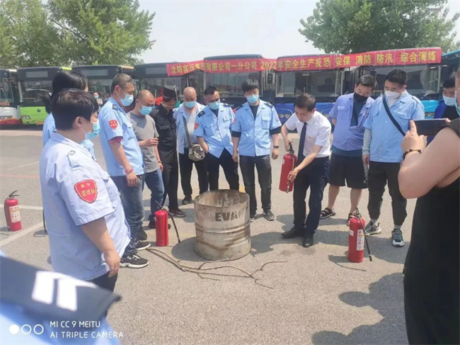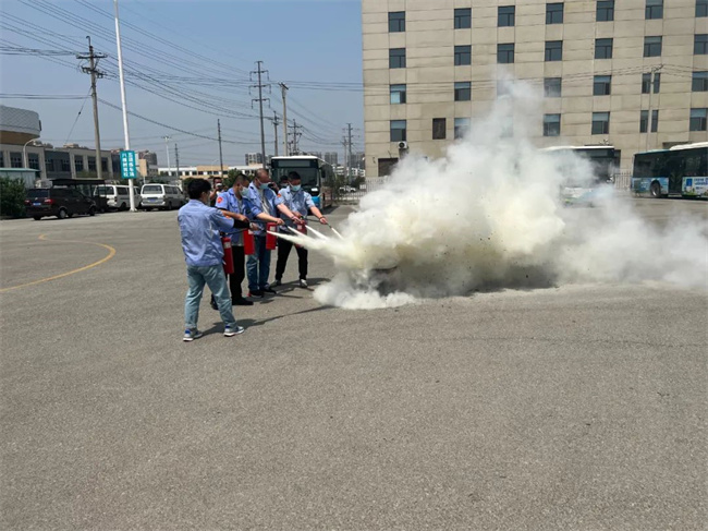 會(huì)后,在公司院內(nèi)進(jìn)行實(shí)地演練,模擬公交車輛突發(fā)火災(zāi)時(shí),駕駛員在應(yīng)急情況下緊急停車,疏散乘客,正確使用滅火器進(jìn)行滅火等內(nèi)容。