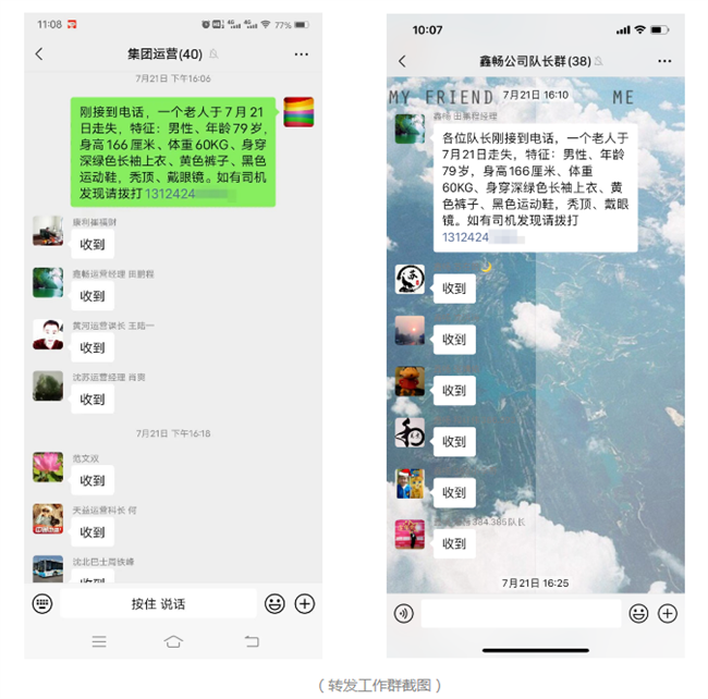 7月21日,沈陽客運集團運營部接到市民求助電話,請求幫忙尋找一名走失的老人。運營部立即將求助信息發(fā)送至各運營單位,由各運營單位轉(zhuǎn)發(fā)至各線路隊長,再由各隊長轉(zhuǎn)發(fā)至各車隊微信工作群。