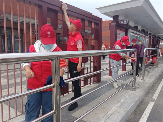 活動中,志愿者們身穿紅馬甲、頭戴小紅帽,手中拿著抹布、清潔刷、水桶等清潔工具,對樞紐站內(nèi)的候車廊、站臺等進行集中大清掃。
