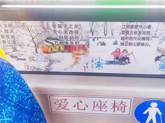 據(jù)方堃介紹,除了給乘客提供座墊套的服務(wù)外,她還通過(guò)上網(wǎng)搜集24節(jié)氣常識(shí)和詩(shī)句,在車(chē)廂內(nèi)的座位附近張貼了24節(jié)氣的相關(guān)詩(shī)句,方便乘客了解民風(fēng)民俗,弘揚(yáng)傳統(tǒng)文化,這些常識(shí)類(lèi)的詩(shī)句很受一些帶孩子乘車(chē)的家長(zhǎng)和孩子們的歡迎。
