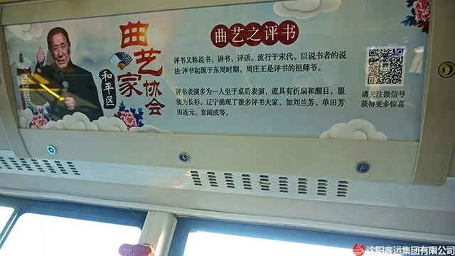 為進(jìn)一步豐富藝術(shù)惠民的內(nèi)容,滿足廣大乘客日益多樣化的藝術(shù)需求,擴(kuò)大“藝術(shù)公交”的影響力,惠及更多的乘客,和平區(qū)文聯(lián)、沈陽客運(yùn)集團(tuán)有限公司、沈陽藝海星辰科技有限公司又聯(lián)合推出了“文學(xué)專號”、“曲藝專號”、“國學(xué)專號”三輛藝術(shù)公交車。藝術(shù)公交車已成為聯(lián)系和溝通藝術(shù)家與乘客的紐帶和橋梁,互動(dòng)雙贏,既激發(fā)了藝術(shù)家的創(chuàng)作靈感和熱情,又提升了乘客的藝術(shù)品味和鑒賞力。